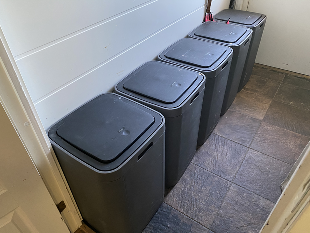 Problemet med dessa, och problemet med de flesta av dessa lösningar på marknaden, är att dom öppnar uppåt. Då dom står i groventrén så blir dom samtidigt en avlastningsyta, så ibland måste man flytta något för att kunna slänga något. Samtidigt så är dom rätt så stora också.