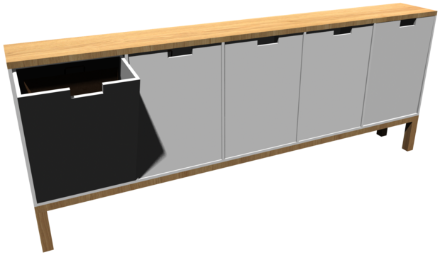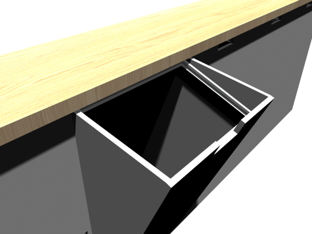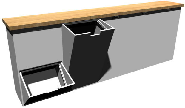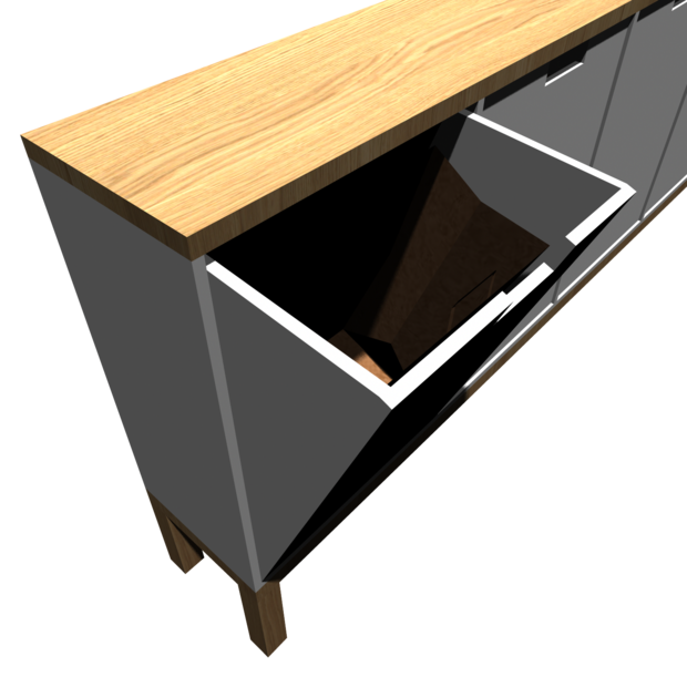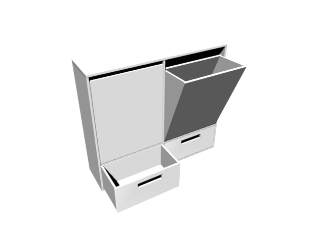Men idén är bra, och det vore nice med en möbel som tar mindre plats i groventrén så jag designade om den igen. Den här gången med lådor som alla vinklas ut, och plats för alla olika typer av återvinning.