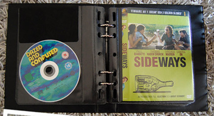 Ok, nu är jag ute efter en förvaring av DVD-filmer som funkar. Vi pratar inte om hyll-lösningar nu utan om förvaring där själva fodralen elimineras och skivan och omslaget sparas. Jag vill inte ha en lösning där jag har en hög plastfickor med bara skivorna i, utan det ska vara plastfickor där även dvd-omslaget ryms. Lite googlande har funnit den här lösningen:
