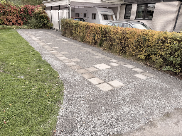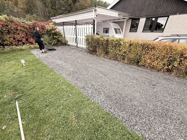Nu är den äntligen klar! Blandat med sjukdom så har vi allteftersom donat med det sista, hyrt en markvibrator och plattat till allt fint och sedan köpt ett släp sand och spridit ut som ska mer eller mindre fixera singeln över tid.