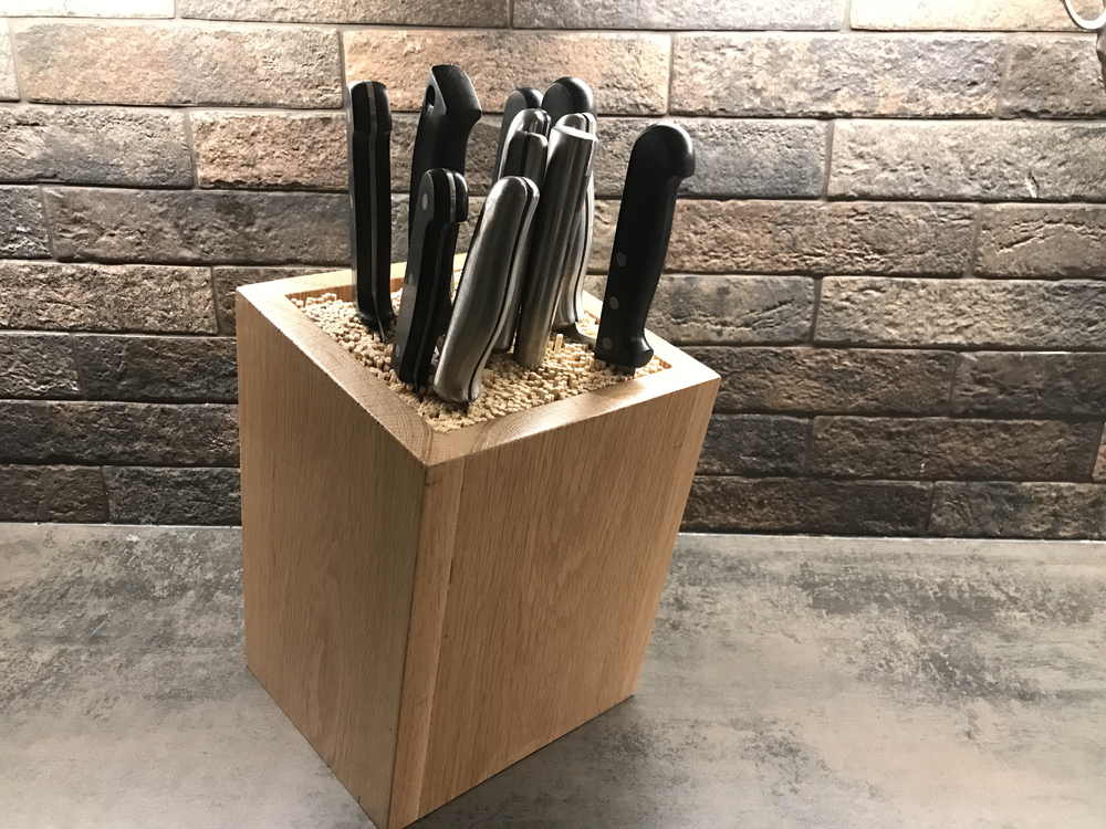 Vi har alla våra knivar i en enda röra i en låda, men Tinas far skickade iväg dem för att bli slipade och efter det får vi inte ens köra dem i diskmaskinen, och då känns det ju rätt dumt att ha dem ligga i en hög i en låda med. Så vi kollade på sådana där knivställ på Cervera men dom var så väldigt dyra, så jag byggde en egen av en ekskiva jag hade hemma redan, samt köpte lite grillspett på Citygross som var superbilligt.