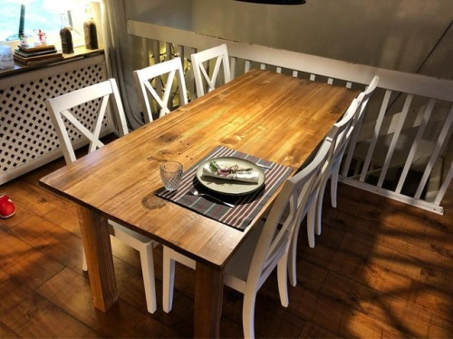 Behövde ett extrabord till julafton, och jag hade en gammal lastpall som sågen kom på som såg stor nog ut, så den fick bli ett bord. Hyvlar och kapar allt rakt och fint och sen så använder jag en borstmaskin för att få tillbaka den rustika känslan igen. Kanske känns lite bakvänt, men det är enklare att montera raka brädor.