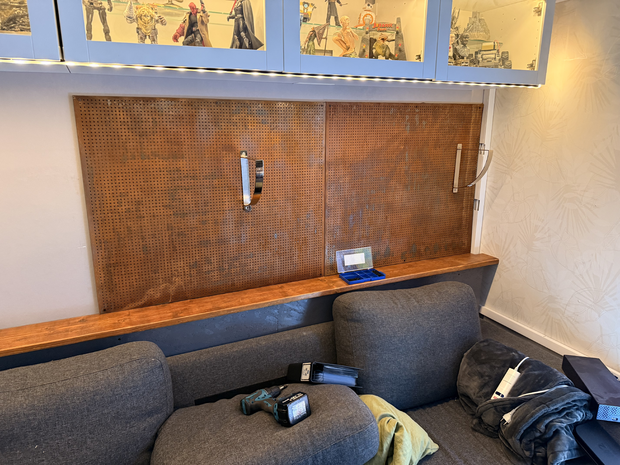 Så jag fick en idé om att köpa verktygstavlor, som man har i verkstaden för verktygskrokar. Slipa dem rena från färg och sedan oxidera dem så de blir rostiga och sätta upp dem på väggen ovanför soffan. På dessa kan jag sedan sätta upp alla vapen-replikor jag har så det blir lite av en vapenvägg, inte minst min M41A Pulse Rifle!