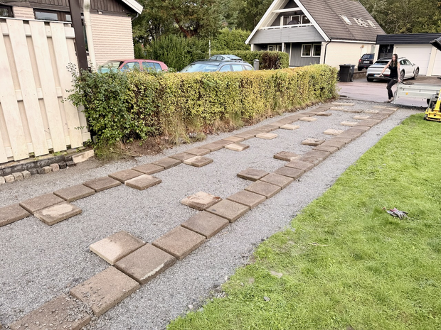 Sen lägga ut plattor på uppfarten. Vi har inte plattor för att täcka hela så detta fick bli lösningen, så jag hoppas att det håller någotsånär ändå, annars får man väl göra om det i framtiden. Tanken är att plattorna ska hjälpa till att fördela trycket från hjulen så klart, så det återstår att se om dom ligger kvar på plats.