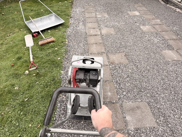 Nu är den äntligen klar! Blandat med sjukdom så har vi allteftersom donat med det sista, hyrt en markvibrator och plattat till allt fint och sedan köpt ett släp sand och spridit ut som ska mer eller mindre fixera singeln över tid.
