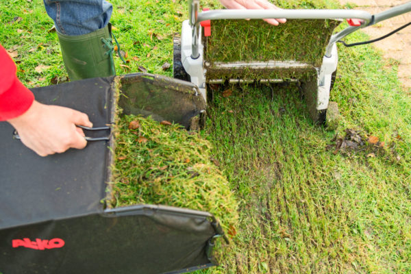 Nu är det dags att vertikalskära gräsmattan. Det måste inte göras varje år, men det är ett bra sätt att få ner näring till rötterna. Efter att du vertikalskurit gräsmattan så ska du stödså gräsmattefrön och efter det toppdressa den och sprida ut det rikligt.