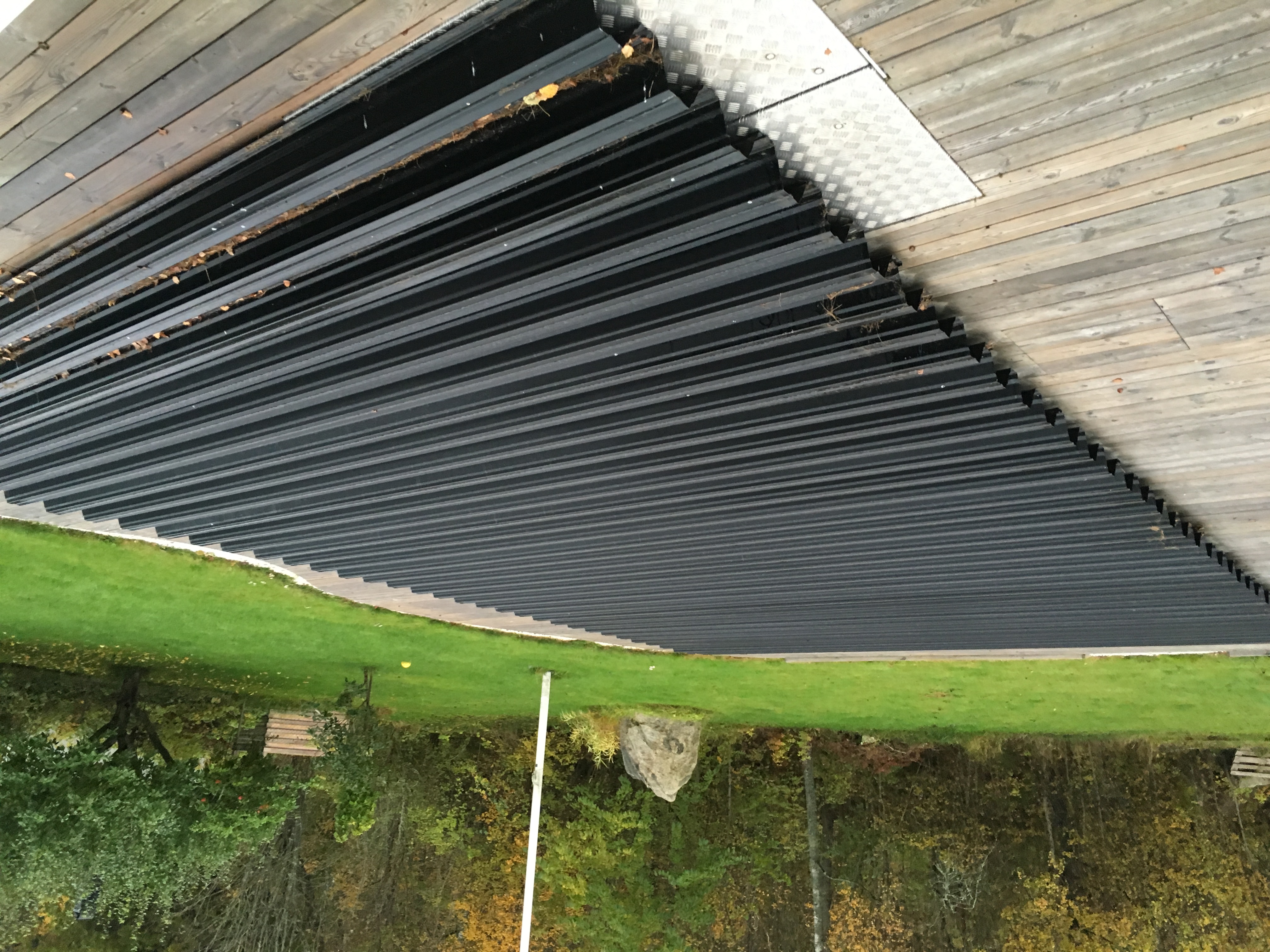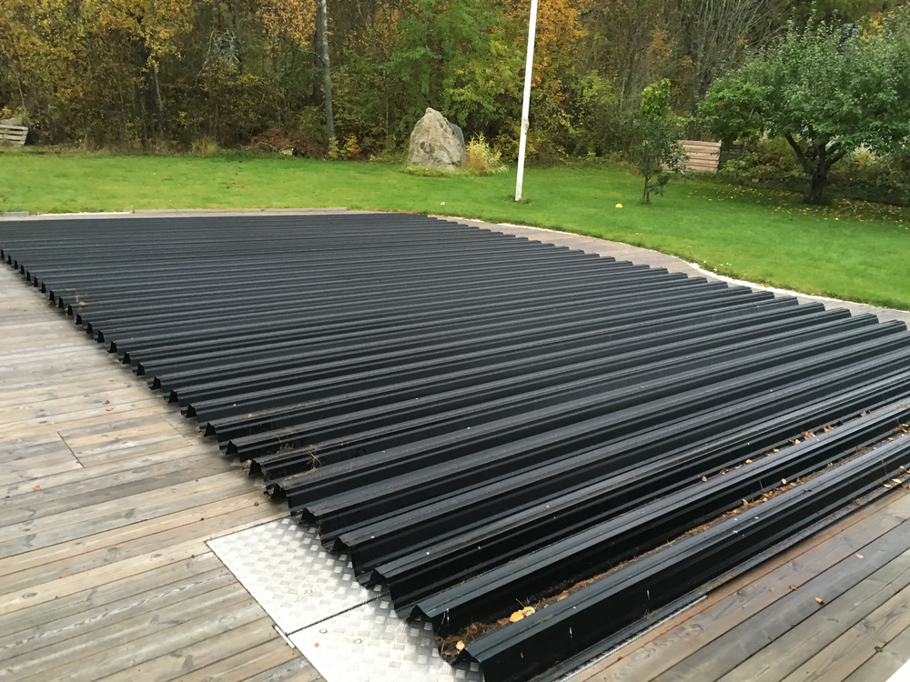 Sen var det dags för vinterstängning, och enorma plåtar skulle läggas över hela poolen. Det är en åtta stycken plåtar som vardera väger säkert 100 kg. Nackdelen med dessa, förutom att dom är sjukt bökiga att ta av och sätta på är att dom har enorma korrugerngar så varje vår så var det massa skit i poolen, plus ett par döda råttor. De senaste åren har jag lämnat presenningen på under plåtarna för att slippa det.