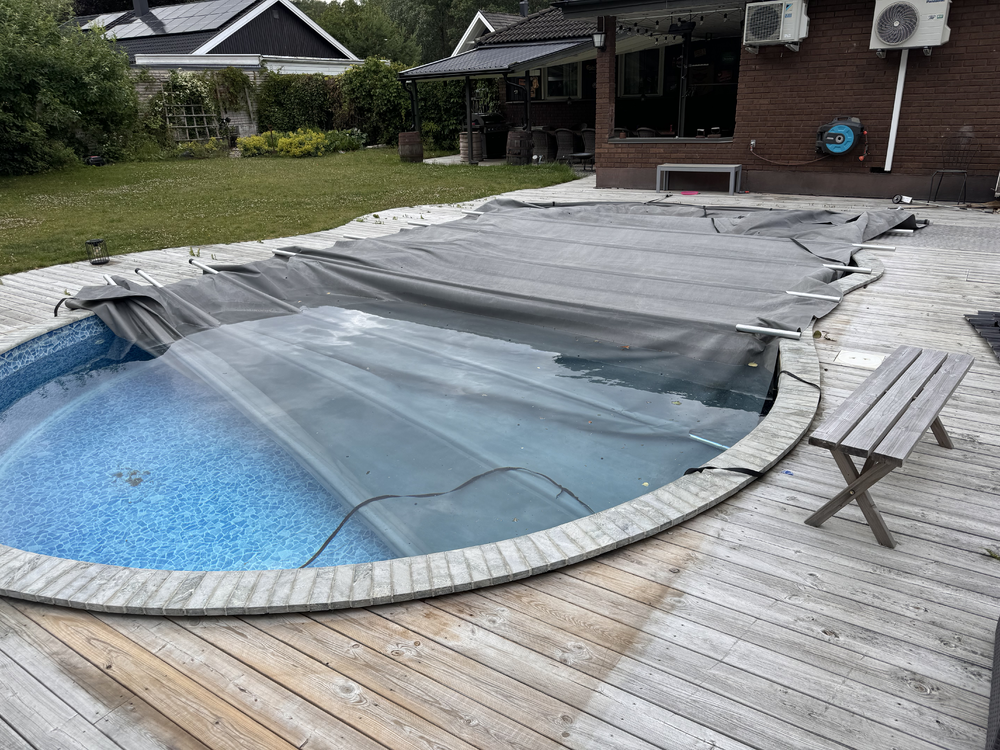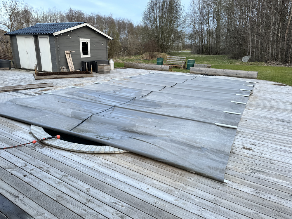 Men presenningen var ändå inte i bra skick, plus att jag har avverkat tre vevar för att veva upp presenningen när man ska öppna poolen för att bada, alla vevar har gått sönder för det är en sådan stor presenning. Så i år har vi behövt vara två personer och dubbelvika presenningen när vi ska öppna poolen, vilket är sjukt drygt.