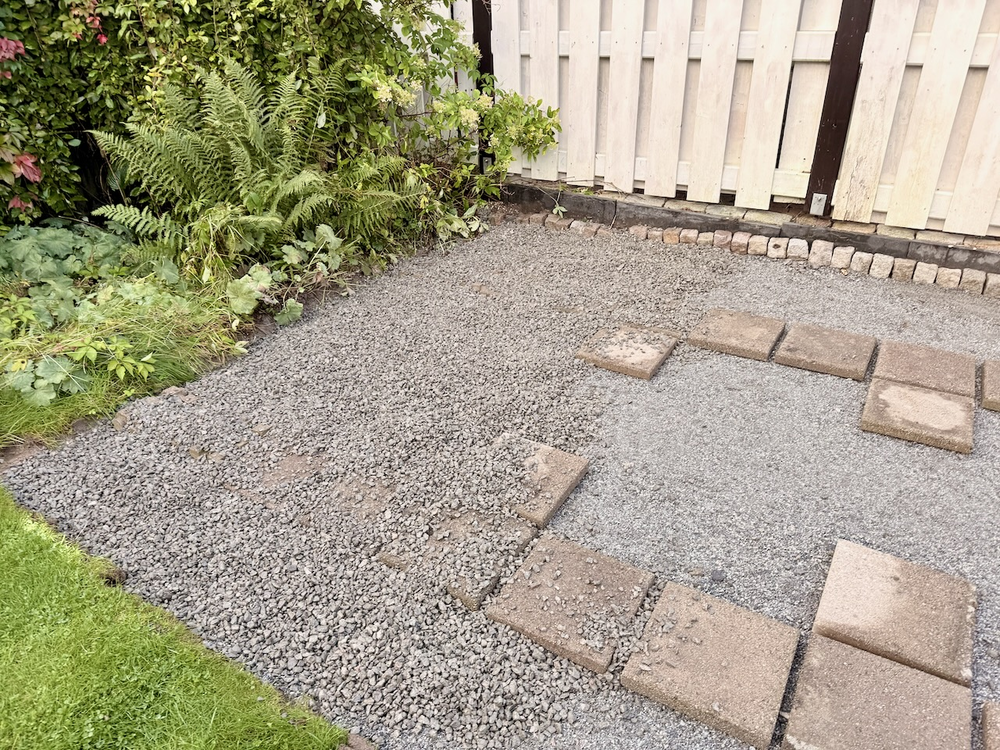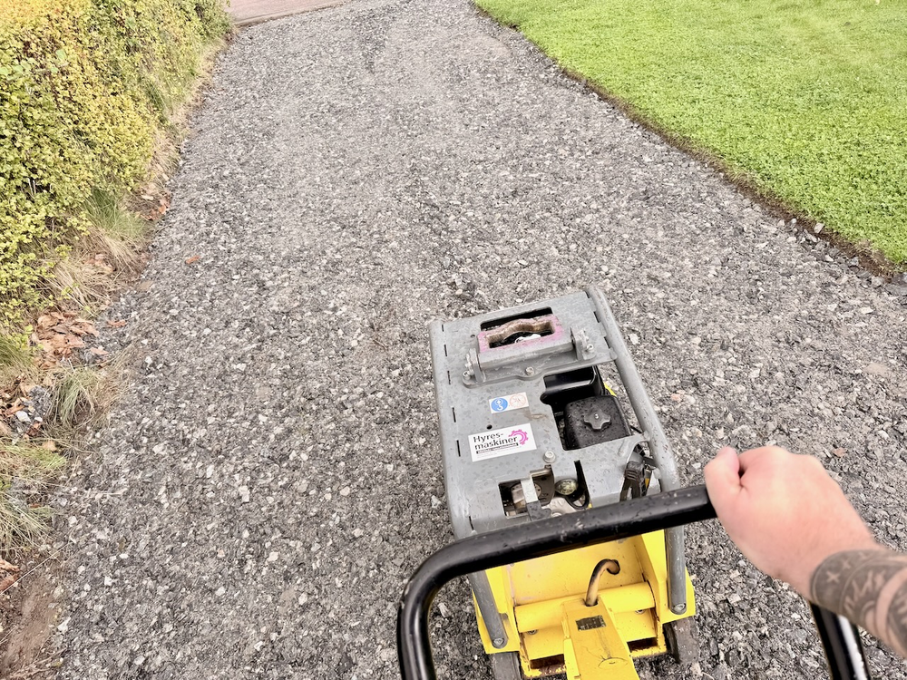 En helkväll med att använda en markvibrator för att platta till bärlager och stenmjölet till en någotsånär platt grund.